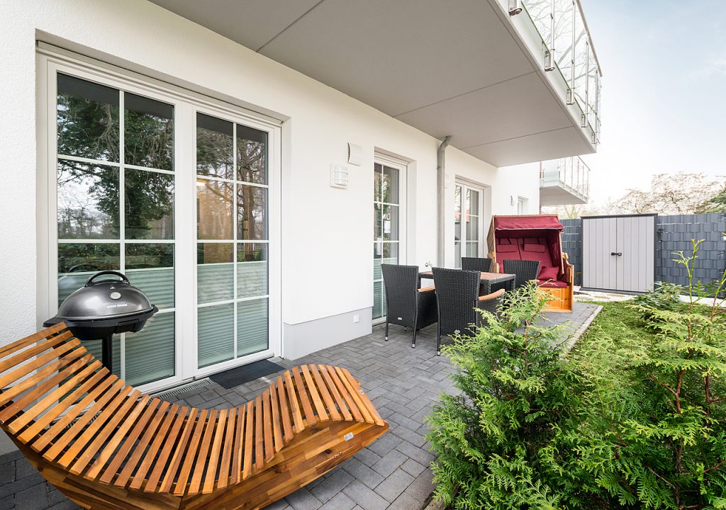 Schöne Terrasse mit kleinem Garten Ein Standkorb steht für Sie auf der Terrasse mit Blick auf den Garten.