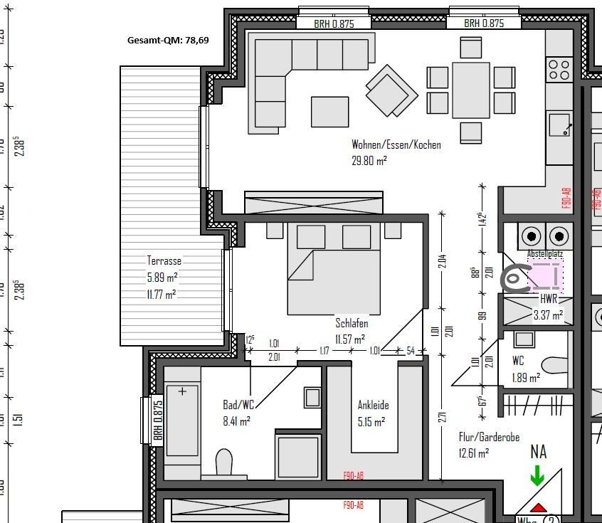 Grundriss der Ferienwohnung Flora auf einen Blick: ca. 79 m² mit Wohn‑/Essbereich, Schlafzimmer (Doppelbett), Ankleidezimmer, Bad mit Wanne und Dusche sowie separatem Gäste‑WC. Zum Vergrößern tippen/klicken.